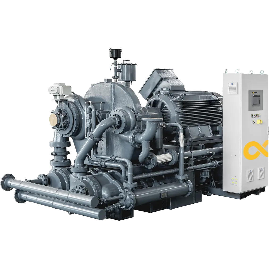 Centrifugal air compressors use high-speed rotating impellers to convert kinetic energy into pressure energy. Known for their oil-free operation, high efficiency, and large capacity, these compressors are widely used in industries like power generation, chemical processing, and air separation.