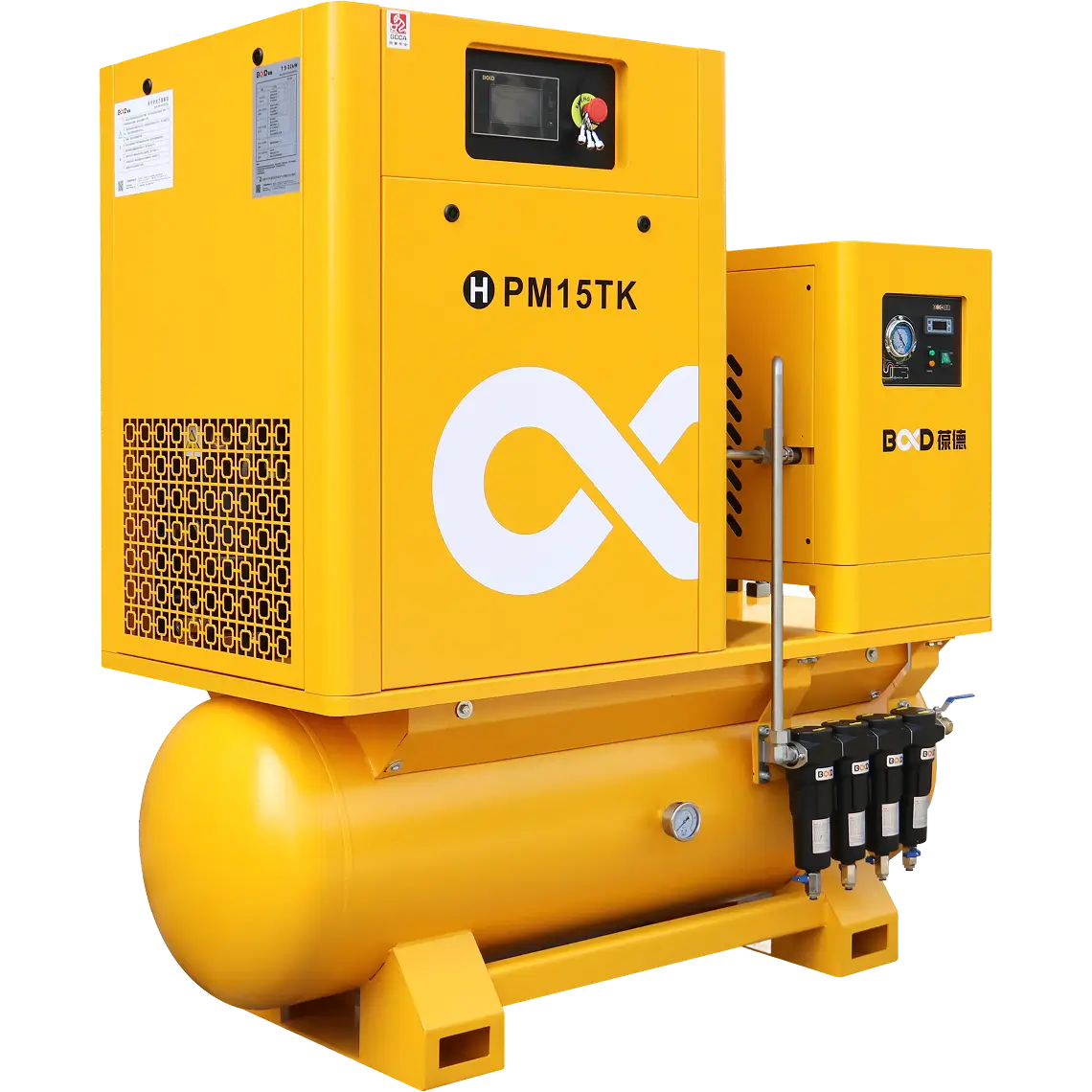 Integrated compressed air system includes screw compressor, refrigerated air dryer, tank specialized for fiber laser cutting machine.