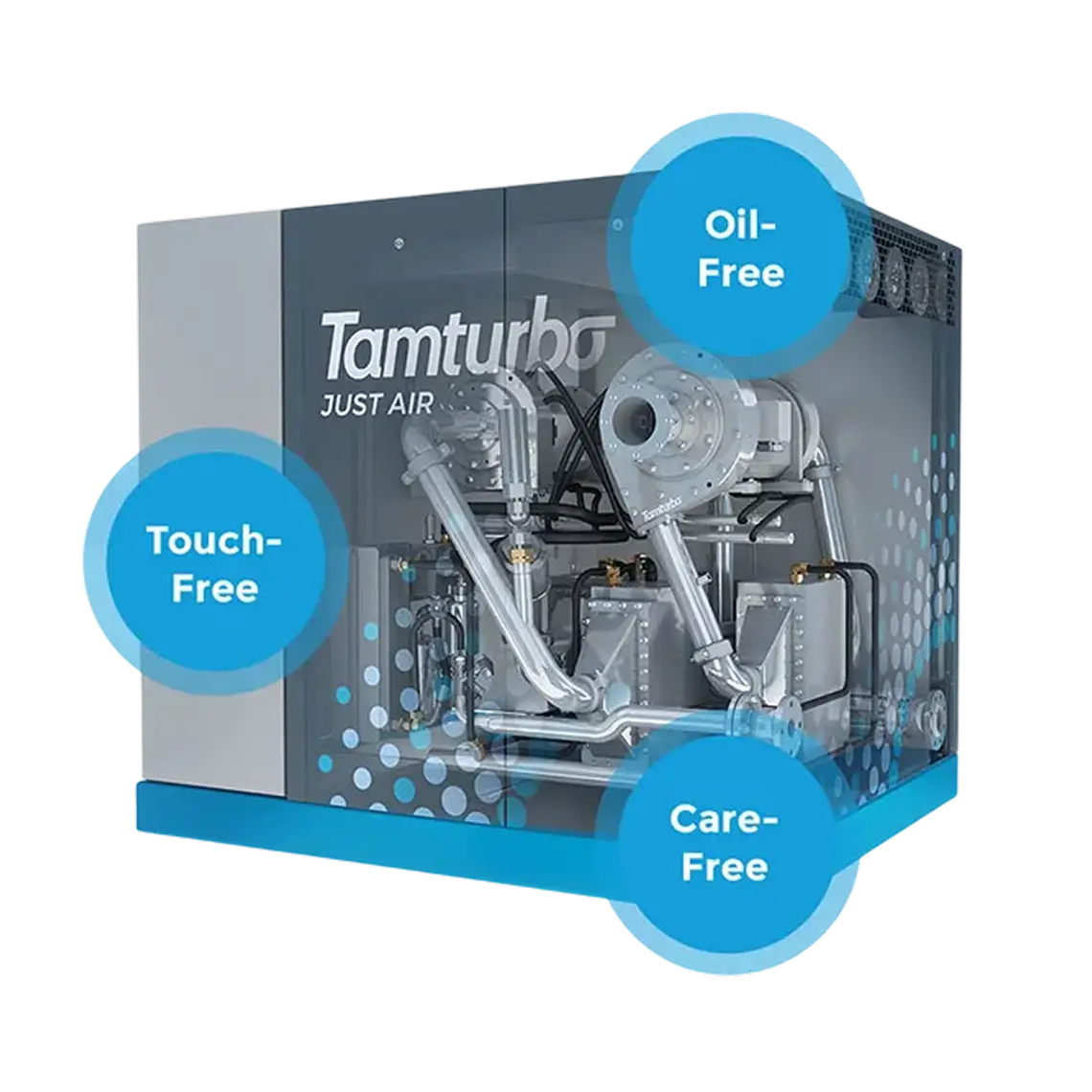 Maintenance-free Tamturbo® Technology makes compressed air care free. All Tamturbo® Touch-Free™ Technology compressors are direct driven high-speed VSD turbo compressors that produce 100% oil-free compressed air for industrial customers.
